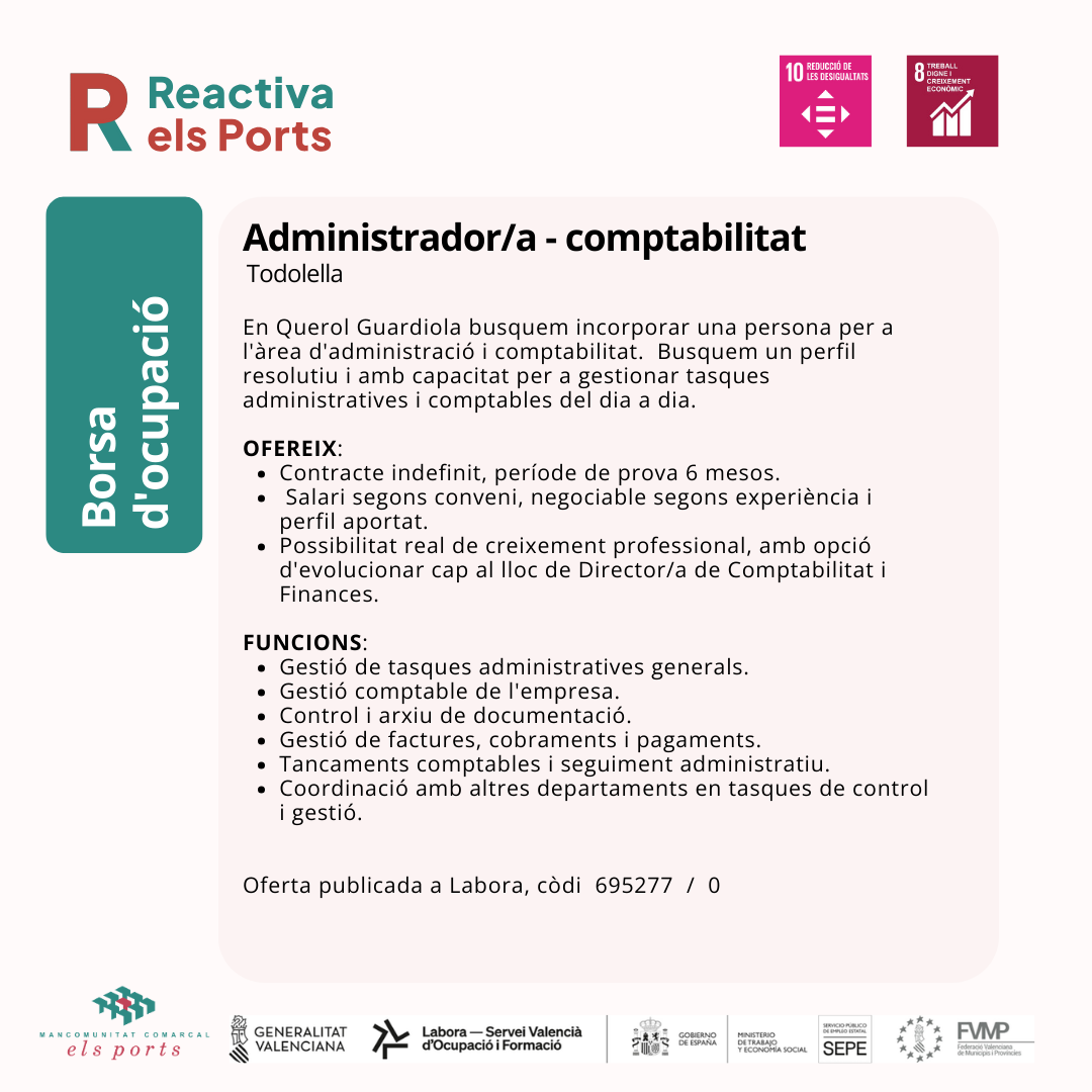 En Querol Guardiola busquem incorporar una persona per a l'àrea d'administració i comptabilitat. Busquem un perfil resolutiu i amb capacitat per a gestionar tasques administratives i comptables del dia a dia.