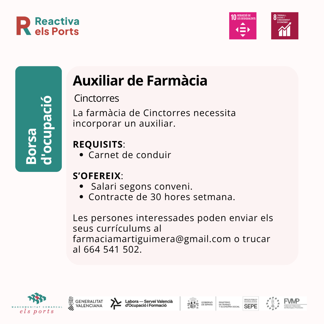 La farmàcia de Cinctorres necessita incorporar un auxiliar.