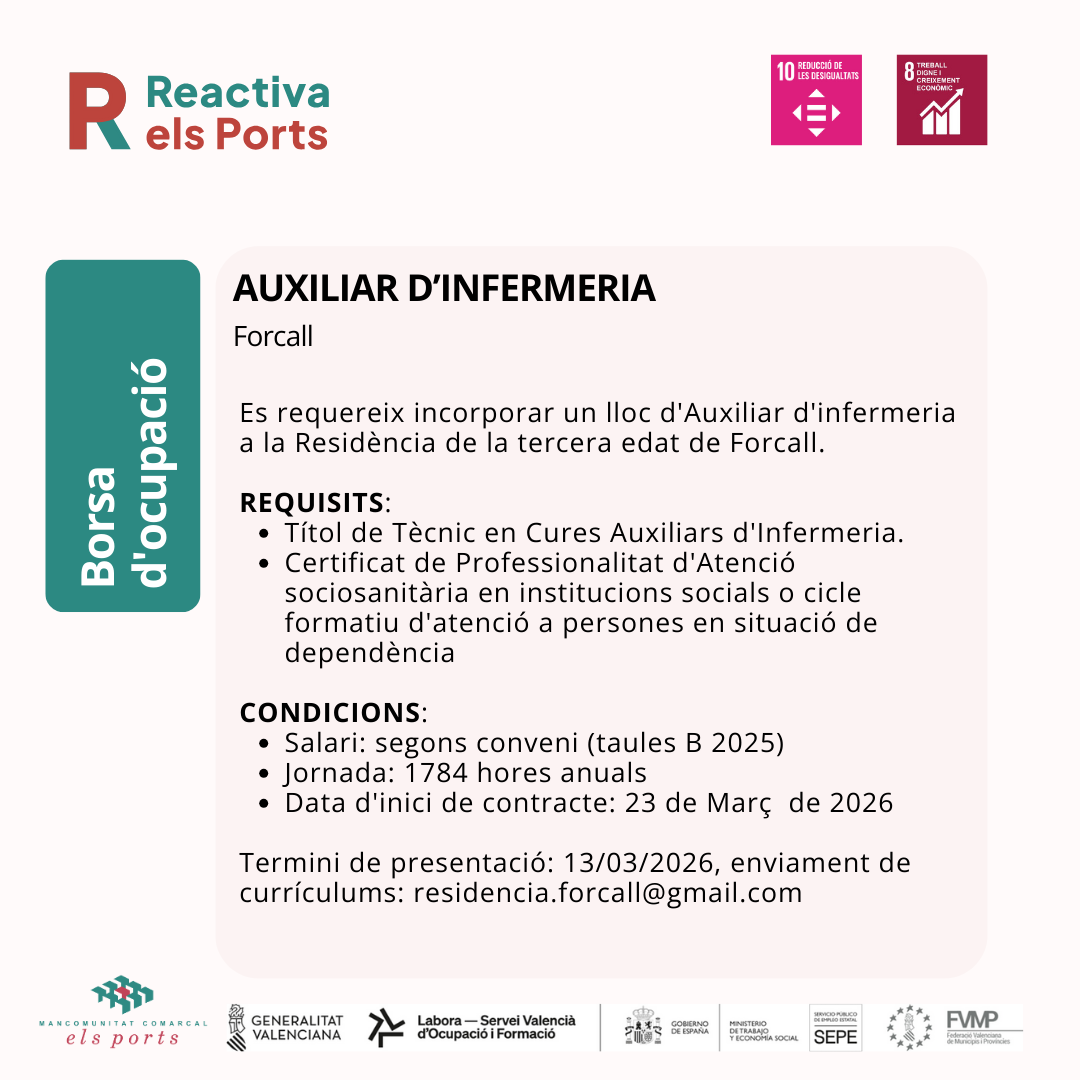 Es requereix incorporar un lloc d'Auxiliar d'infermeria a la Residència de la tercera edat de Forcall.