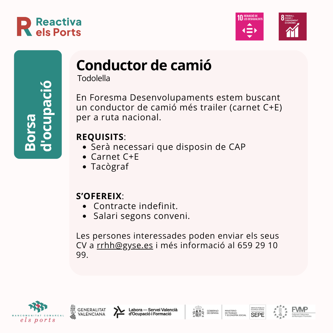 En Foresma Desenvolupaments estem buscant un conductor de camió més trailer (carnet C+E) per a ruta nacional.