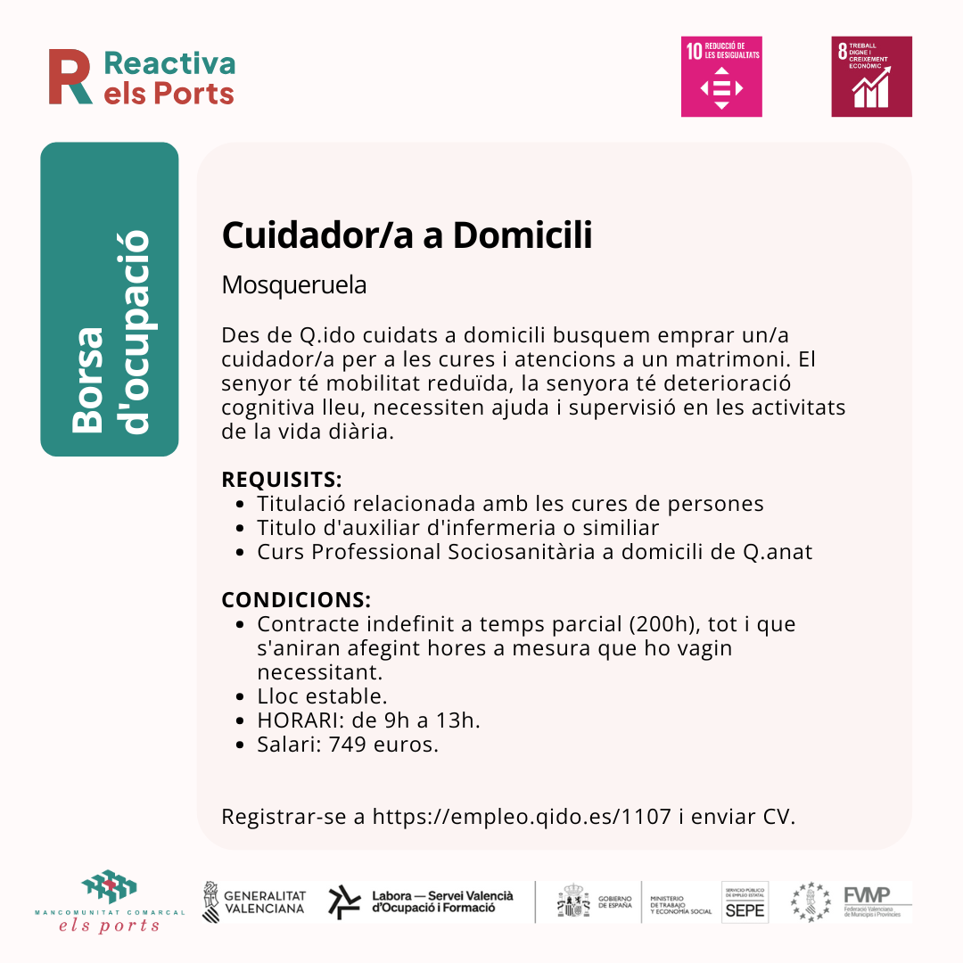 Des de Q.anat cuidats a domicili busquem emprar un/a cuidador/a per a les cures i atencions a un matrimoni. El senyor té mobilitat reduïda, la senyora té deterioració cognitiva lleu, necessiten ajuda i supervisió en les activitats de la vida diària.