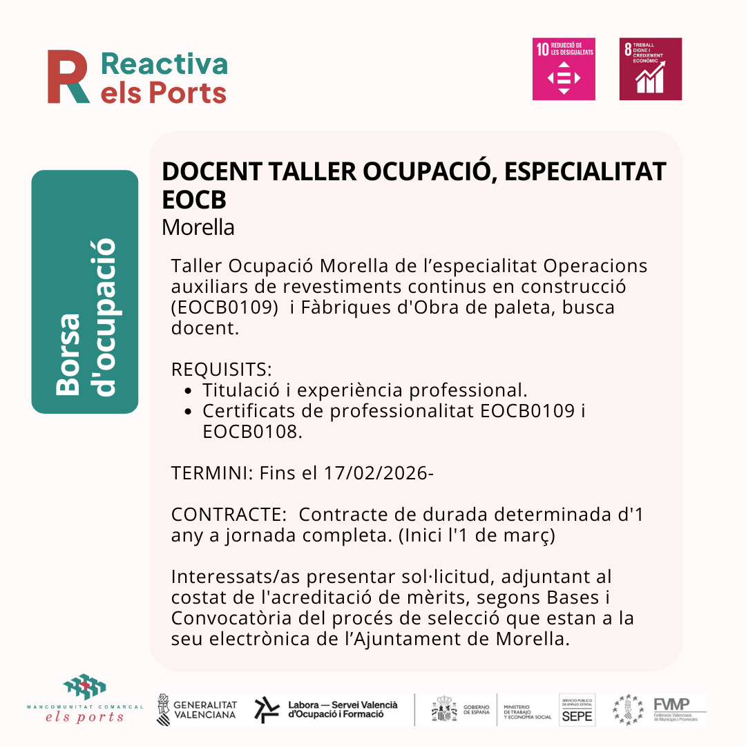 Taller Ocupació Morella de l’especialitat Operacions auxiliars de revestiments continus en construcció (EOCB0109) i Fàbriques d'Obra de paleta, busca docent.