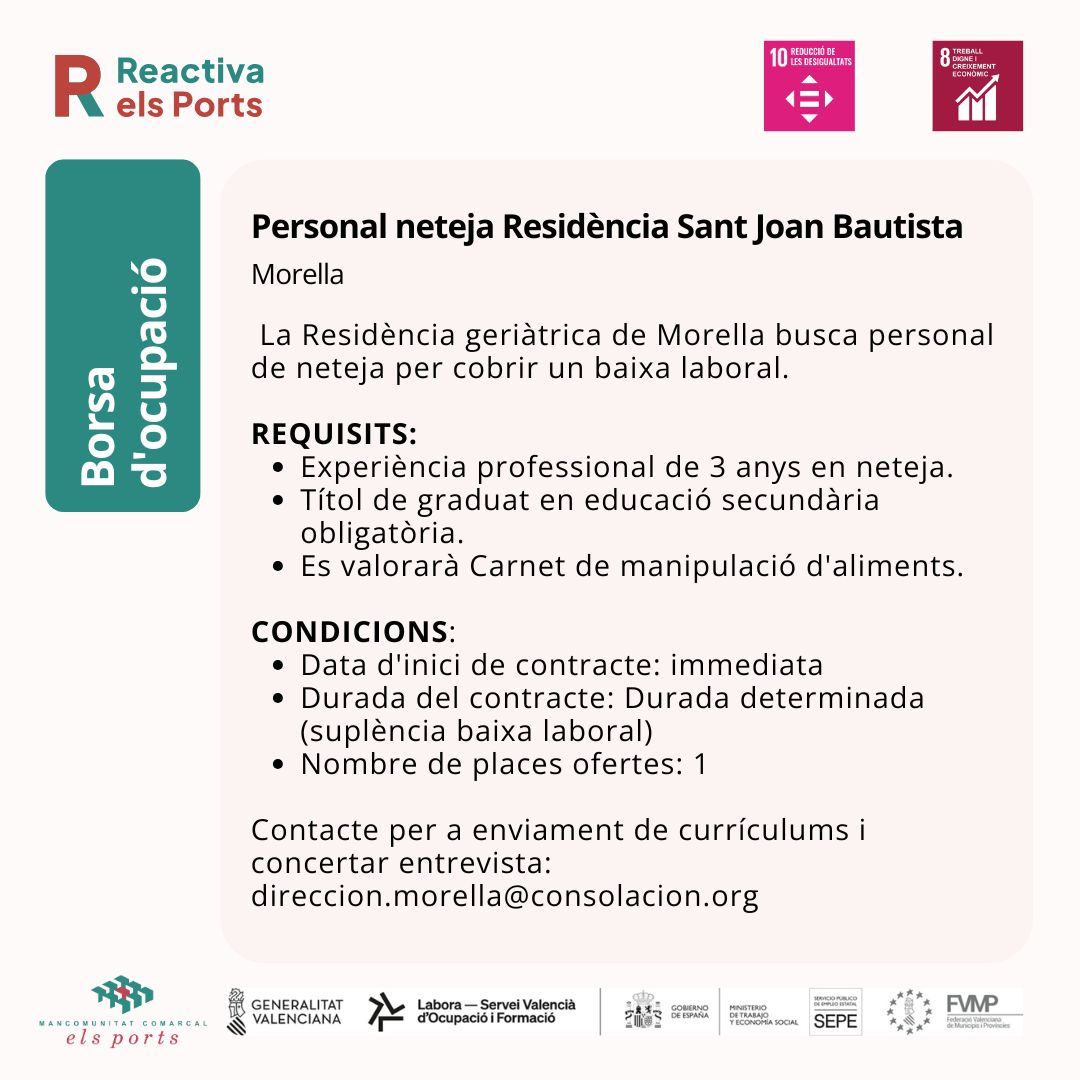 La Residència geriàtrica de Cantavella busca nou infermer/a per acompanyament d’usuaris a les consultes de les proves que hagin de realitzar, cures i supervisió, organitzar i fer seguiment de la documentació sanitària.