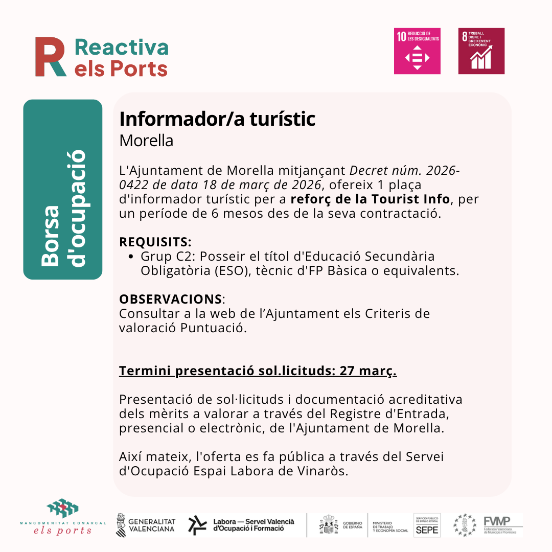 L'Ajuntament de Morella mitjançant Decret núm. 2026-0422 de data 18 de març de 2026, ofereix 1 plaça d'informador turístic per a reforç de la Tourist Info, per un període de 6 mesos des de la seva contractació.
