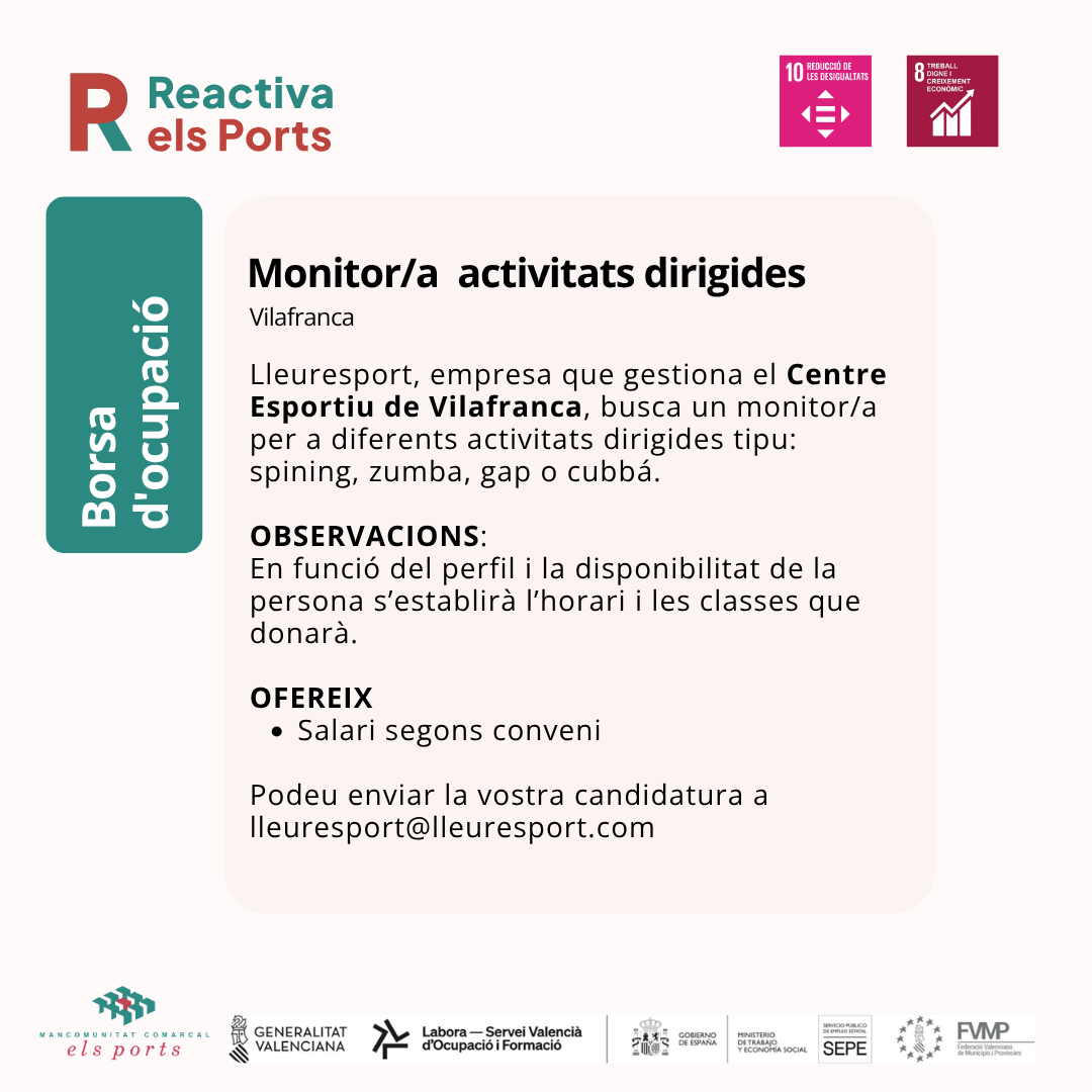Lleuresport, empresa que gestiona el Centre Esportiu de Vilafranca, busca un monitor/a per a diferents activitats dirigides tipus: spining, zumba, gap o cubbá.