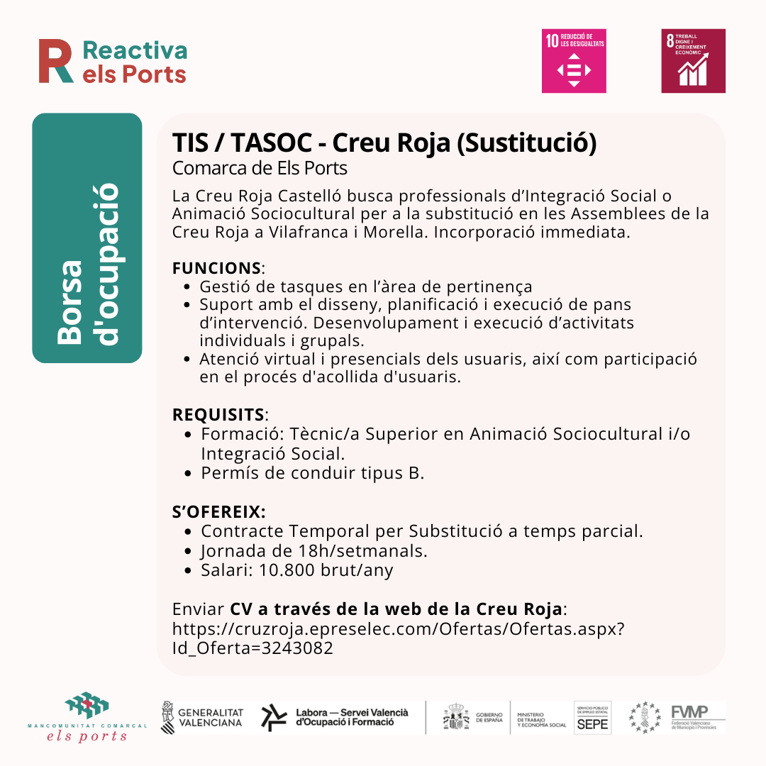 馃敶La Creu Roja Castell贸 busca professionals d鈥橧ntegraci贸 Social o Animaci贸 Sociocultural per a la substituci贸 en les Assemblees de la Creu Roja a Vilafranca i Morella. Incorporaci贸 immediata.